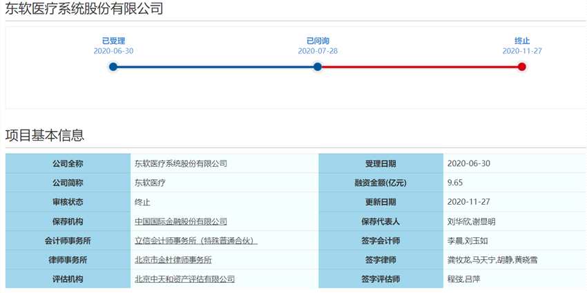 據(jù)悉,2020年9月29日,東軟醫(yī)療因發(fā)行上市申請文件中記載的財務資料已過有效期,需要補充提交。根據(jù)《審核規(guī)則》第六十四條(六),上交所中止其發(fā)行上市審核。2020年11月10日,根據(jù)《審核規(guī)則》第六十六條,《審核規(guī)則》第六十四條(六)所列中止審核情形消除,上交所恢復東軟醫(yī)的發(fā)行上市審核。