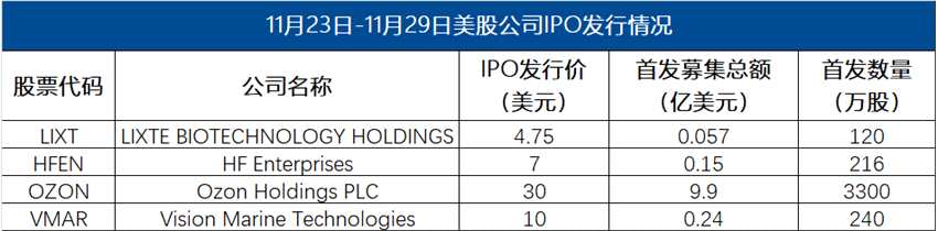 12月1日,據(jù)統(tǒng)計,上周(11月23日-11月29日)境外資本市場IPO較為冷清,共有4家公司在美股上市,無公司在港股市場上市,另有3家公司通過港交所聆訊。
