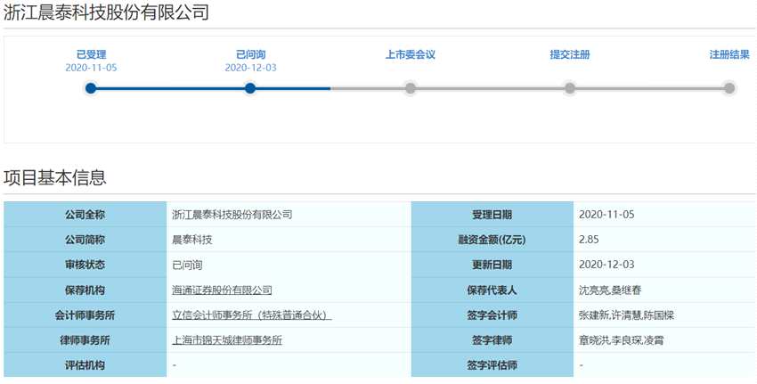 12月4日,獲悉,浙江晨泰科技股份有限公司(以下簡稱:晨泰科技)的科創(chuàng)板IPO申請已于12月3日獲上交所問詢。