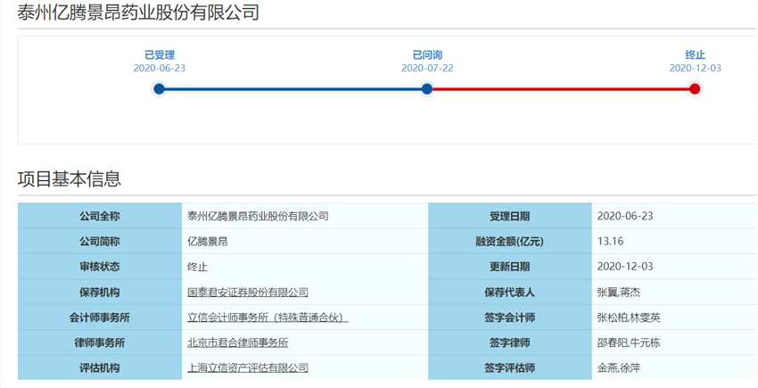 12月4日,獲悉,泰州億騰景昂藥業(yè)股份有限公司(以下簡(jiǎn)稱:億騰景昂)的科創(chuàng)板IPO申請(qǐng)已于12月3日終止。