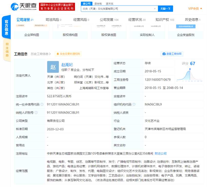 據(jù)悉,炎央(天津)文化發(fā)展有限公司成立于2018年5月,法定代表人為趙禹妃,經(jīng)營范圍含電視劇、電影、專題、綜藝、動畫等節(jié)目制作、發(fā)行;廣播電視節(jié)目制作;動畫設(shè)計;動漫創(chuàng)作;互聯(lián)網(wǎng)上銷售動漫產(chǎn)品等。