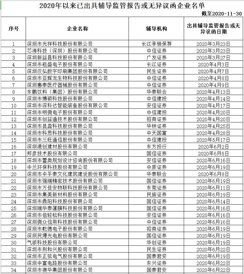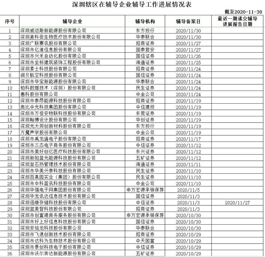 1、截至2020年11月30日,深圳轄區(qū)擬上市輔導(dǎo)企業(yè)有119家。