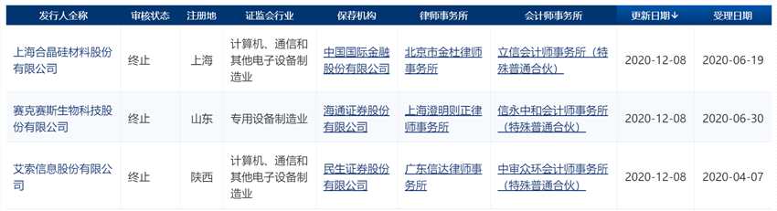 12月9日,獲悉,上海合晶硅材料股份有限公司(以下簡(jiǎn)稱(chēng):上海合晶)、賽克賽斯生物科技股份有限公司(以下簡(jiǎn)稱(chēng):賽克賽斯)、艾索信息股份有限公司(以下簡(jiǎn)稱(chēng):艾索信息)的科創(chuàng)板IPO申請(qǐng)已于12月8日終止。