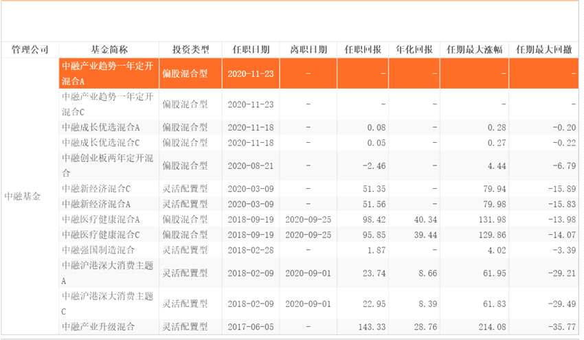 除甘傳琦最新任職的中融產(chǎn)業(yè)趨勢(shì)一年定開(kāi)混合,管理的其它4只基金分別是:中融產(chǎn)業(yè)升級(jí)混合、中融成長(zhǎng)優(yōu)選混合A/C、中融創(chuàng)業(yè)板兩年定開(kāi)混合、中融新經(jīng)濟(jì)混合A/C任職時(shí)間為2017年6月、2020年11月、2020年8月、2020年3月。
