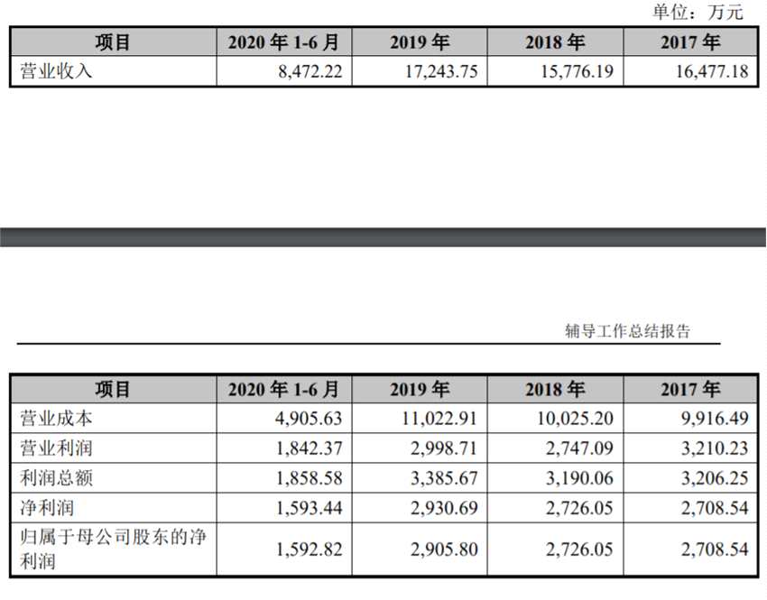 根據(jù)公告顯示,島田大鵬主要從事精密工業(yè)清洗產(chǎn)品的研發(fā)、設(shè)計、生產(chǎn)和銷售。根據(jù)天職國際會計師事務(wù)所(特殊普通合伙)為此出具了標(biāo)準(zhǔn)無保留意見的“天職業(yè)字[2020]38853號”《審計報告》,主要會計數(shù)據(jù):2017年-2020年上半年,公司實現(xiàn)營業(yè)收入1.65億元、1.58億元、1.72億元、8472.22萬元;歸屬于母公司所有者的凈利潤2708.54萬元、2726.05萬元、2905.8萬元、1592.82萬元。