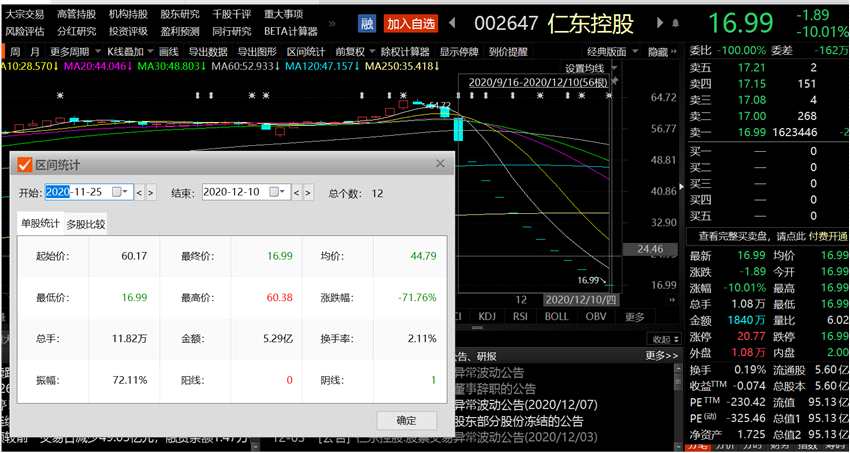 12月10日,獲悉,A股公司仁東控股(002647)今日發(fā)布股票交易波動公告,這次該公司近三周以來,發(fā)布的第四次股票交易波動公告,因公司股價已連續(xù)12個交易日跌停(自11月25日至12月10日),依照相關規(guī)定,深交所自2020年12月9日起暫停該標的股票融資買入,恢復時間另行通知。