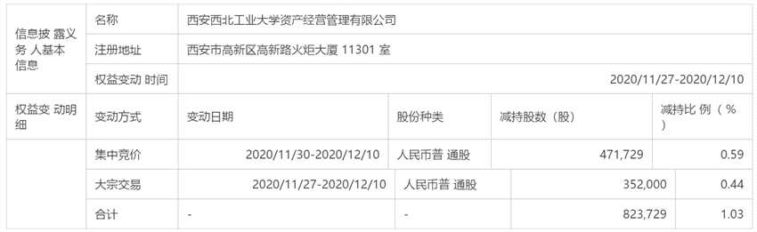 公告顯示,西工大資產(chǎn)管理公司于2020年11月30日-2020年12月10日通過集中競價方式減持鉑力特47.17萬股,減持比例為0.59%;于2020年11月27日-2020年12月10日通過大宗交易方式減持鉑力特35.20萬股,減持比例為0.44%。西工大資產(chǎn)管理公司合計減持82.37萬股,合計減持比例為1.03%。