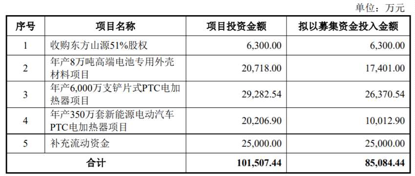 東方電熱本次募集資金不超過8.51億元(含本數(shù)),扣除發(fā)行費(fèi)用后全部用于收購(gòu)東方山源51%股權(quán)、年產(chǎn)8萬(wàn)噸高端電池專用外殼材料項(xiàng)目、年產(chǎn)6000萬(wàn)支鏟片式PTC電加熱器項(xiàng)目、年產(chǎn)350萬(wàn)套新能源電動(dòng)汽車PTC電加熱器項(xiàng)目和補(bǔ)充流動(dòng)資金。