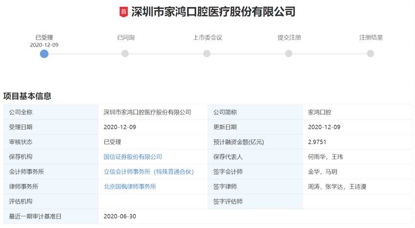 12月10日,獲悉,深圳市家鴻口腔醫(yī)療股份有限公司(公司簡稱:家鴻口腔)創(chuàng)業(yè)板IPO申請于12月9日獲深交所受理,保薦機構(gòu)為國信證券。