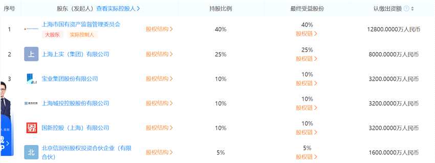 根據(jù)天眼查數(shù)據(jù)顯示,公司前幾大股東包含:上海市國有資產(chǎn)監(jiān)督管理委員會、上海上實(集團)有限公司、寶業(yè)集團股份有限公司、上海城投控股股份有限公司、國新控股(上海)有限公司。