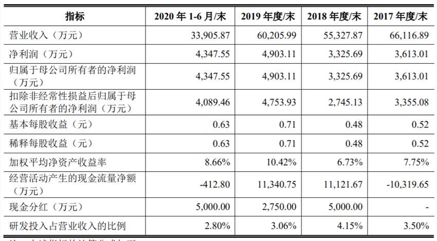 2017年至2020上半年,公司實現(xiàn)營收分別為6.61億元、5.53億元、6.02億元、3.39億元;同期實現(xiàn)歸屬母公司所有者凈利潤分別為3613.01萬元、3325.69萬元、4903.11萬元、4347.55萬元。