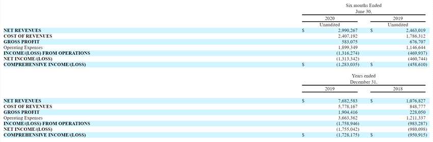 招股書顯示,2020年上半年,物農(nóng)網(wǎng)營收增速放緩。招股書顯示,2018年和2019年,該公司凈營收分別為107.7萬美元和768.2萬美元。2019年營收同比增長613%。2019年上半年和2020年上半年,凈營收分別為246.3萬美元和299萬美元,2020年上半年營收同比增長21%。