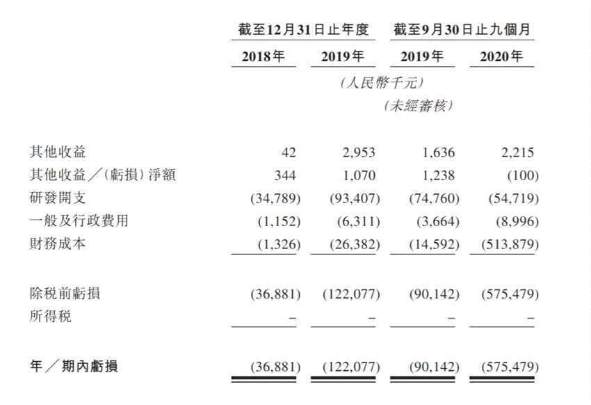 招股書顯示,在過去的2018年、2019年和2020年前九個(gè)月,兆科眼科都沒有營業(yè)收入,相應(yīng)的凈虧損分別為 0.37億、1.22億和 5.75