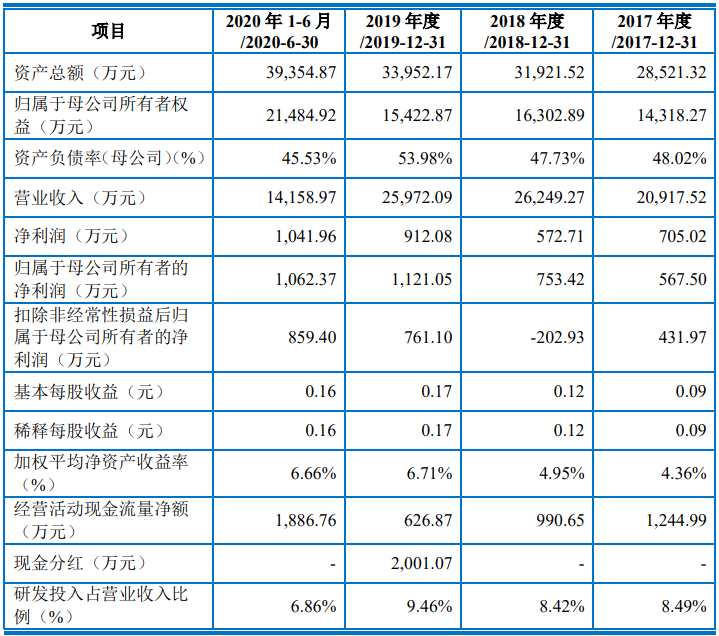 2017年-2020年上半年,宏微科技實(shí)現(xiàn)營(yíng)業(yè)收入2.09億元、2.62億元、2.60億元、1.42億元;歸屬于母公司所有者的凈利潤(rùn)567.50萬(wàn)元、753.42萬(wàn)元、1121.05萬(wàn)元、1062.37萬(wàn)元。