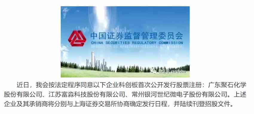 證監(jiān)會同意聚石化學(xué)、富淼科技、銀河微電科創(chuàng)板IPO注冊