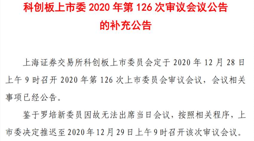 鑒于羅培新委員因故無(wú)法出席當(dāng)日會(huì)議,按照相關(guān)程序,上市委決定推遲至2020年12月29日上午9時(shí)召開(kāi)該次審議會(huì)議。