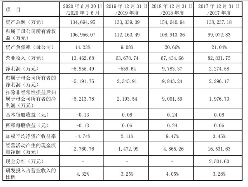 2017年至2020年6月,公司實現(xiàn)營業(yè)收入分別為8.28億元、6.74億元、6.37億元、1.35億元;同期實現(xiàn)歸屬于母公司所有者的凈利潤分別為2296.17萬元、9843.24萬元、2345.91萬元、-5191.75萬元。