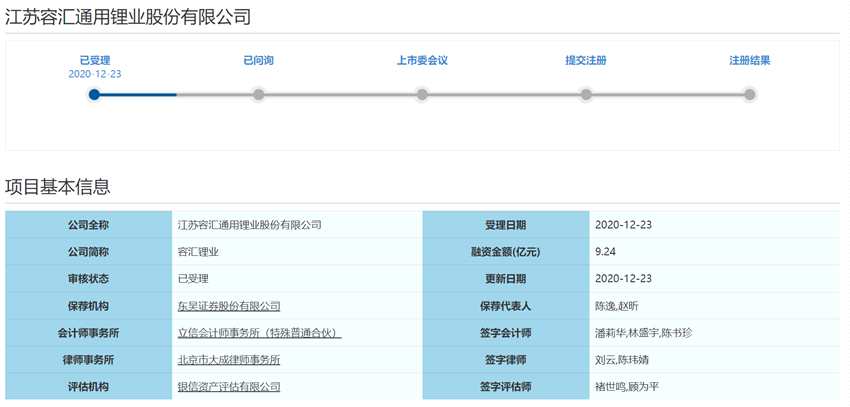 摘要: 12月24日,獲悉,江蘇容匯通用鋰業(yè)股份有限公司(以下簡稱“容匯鋰業(yè)”)科創(chuàng)板IPO已獲上交所受理,本次發(fā)行上市保薦機構為東吳證券。