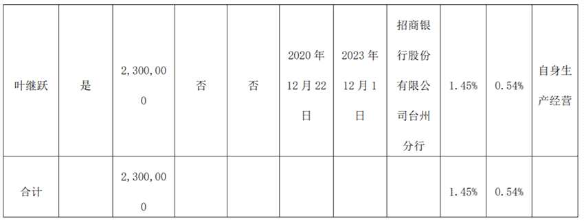 公司于2020年12月23日收到控股股東葉繼躍通知,因自身生產(chǎn)經(jīng)營(yíng),葉繼躍將其所持有公司的230萬股(占其所持股份1.45%,占公司總股本0.54%)質(zhì)押給了招商銀行股份有限公司臺(tái)州分行。