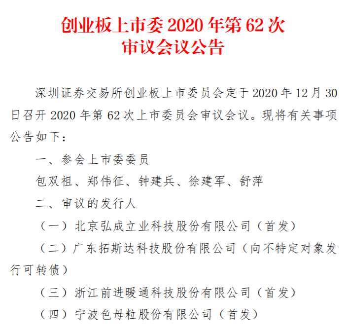 12月24日,獲悉,深圳證券交易所創(chuàng)業(yè)板上市委員會定于2020年12月30日召開2020年第62次上市委員會審議會議。屆時,對北京弘成立業(yè)科技股份有限公司(下稱:弘成立業(yè))、浙江前進(jìn)暖通科技股份有限公司(下稱:前進(jìn)科技)、寧波色母粒股份有限公司(下稱:寧波色母)創(chuàng)業(yè)板IPO首發(fā)及廣東【拓斯達(dá)(300607)、股吧】科技股份有限公司(下稱:300607拓斯達(dá))發(fā)行可轉(zhuǎn)債進(jìn)行審核。