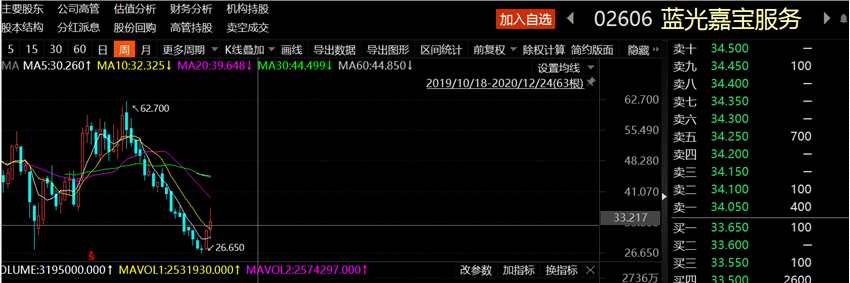 最新數(shù)據(jù)顯示,截止12月24日收盤,藍光嘉寶服務(wù)報收34.05港元,這個價格較今年8月62.7港元的高位跌去了45%,股價近乎腰斬;而從整個2020年來看,今年1月2日,藍光嘉寶服務(wù)收盤價為49港元,照此計算,今年以來藍光嘉寶的股價也跌去了30%。