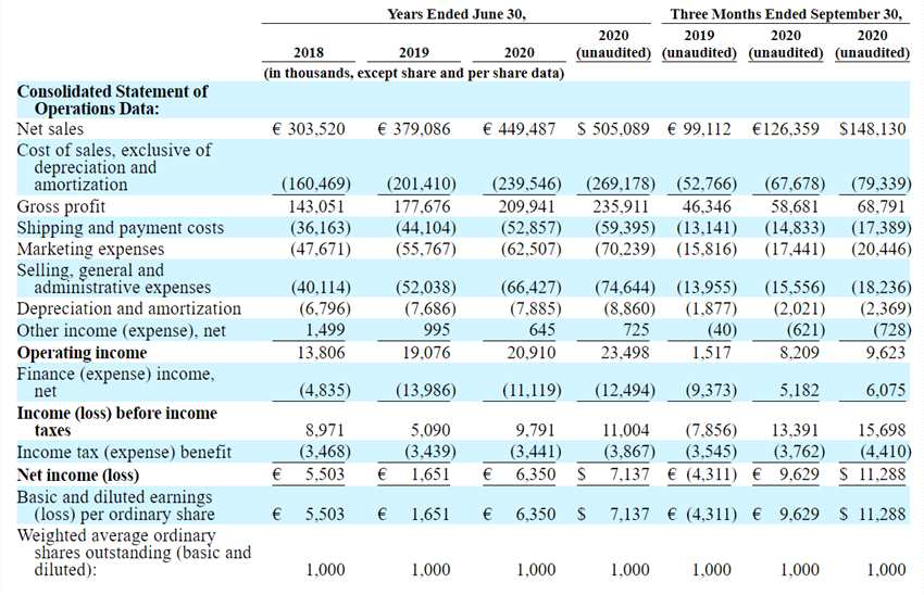 招股書顯示,截至6月30日止2018-2020財年及截至2020年9月30日止三個月,該公司凈銷售額分別為3億歐元、3.8億歐元、4.5億歐元及1.3億歐元;同期,凈利潤分別為550.3萬歐元、165.1萬歐元、635萬歐元及962.9萬歐元。
