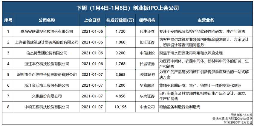 據(jù)創(chuàng)業(yè)板上市委公告顯示,下周(1月4日-1月8日),創(chuàng)業(yè)板將迎來8家企業(yè)上會: