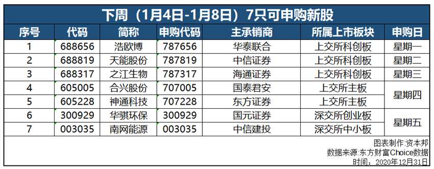 下周(1月4日-1月8日)將有7只新股可申購。其中,上交所科創(chuàng)板3只、上交所主板2只、深交所創(chuàng)業(yè)板1只、深交所中小板1只。
