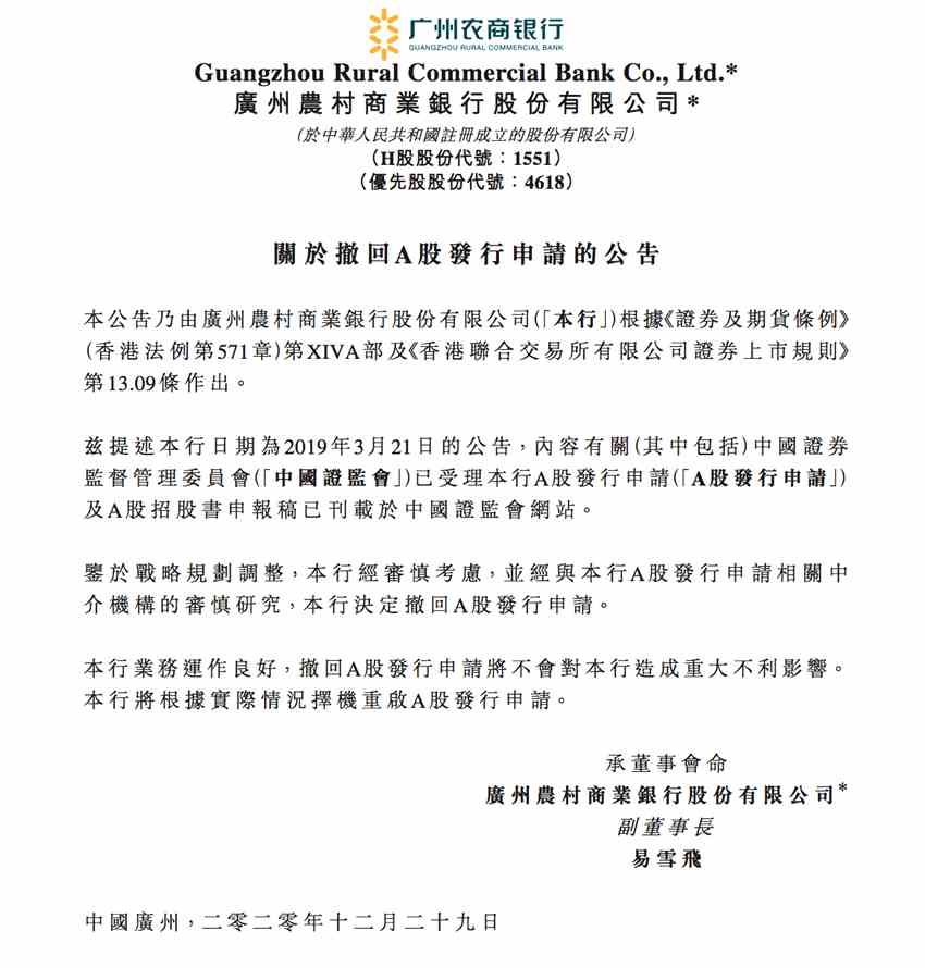 本周關(guān)注點(diǎn)自然落在了兩家企業(yè):廣州農(nóng)商行、馳田股份。廣州農(nóng)商行原定于12月30日上會接受IPO審核,如果順利過會將成為繼重慶農(nóng)商行之后,第二家“A+H”上市農(nóng)商行,距離A股上市差臨門一腳之時(shí),該行12月29日卻發(fā)布《關(guān)于撤回A股發(fā)行申請的公告》,稱鑒于戰(zhàn)略規(guī)劃調(diào)整,經(jīng)審慎考慮,并經(jīng)與該行A股發(fā)行申請相關(guān)中介機(jī)構(gòu)的審慎研究,決定撤回A股發(fā)行申請。