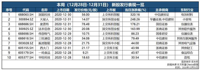 本周(12月28日-12月31日)有10只新股上市,其中上交所科創(chuàng)板4只、上交所主板3只、深交所創(chuàng)業(yè)板2只、深交所中小板1只。
