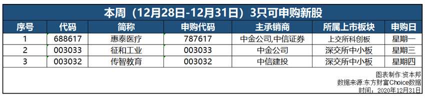 本周(12月28日-12月31日)只有3只新股可申購。其中,上交所科創(chuàng)板1只、另外深交所中小板2只。