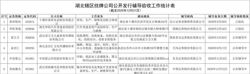 截至2020年12月末,湖北轄區(qū)6家公司擬掛牌精選層