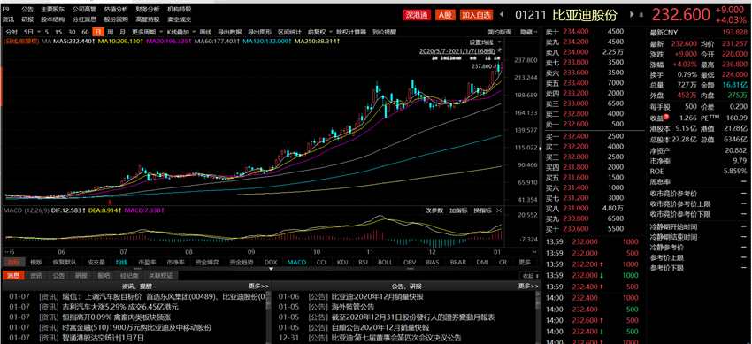 港股二級(jí)市場方面,比亞迪股價(jià)延續(xù)上漲趨勢。截至發(fā)稿,該公司股價(jià)漲4.03%,最新股價(jià)為232.6港元,盤中最高236.8港元,股價(jià)一度逼近創(chuàng)新高,總市值6346億港元。