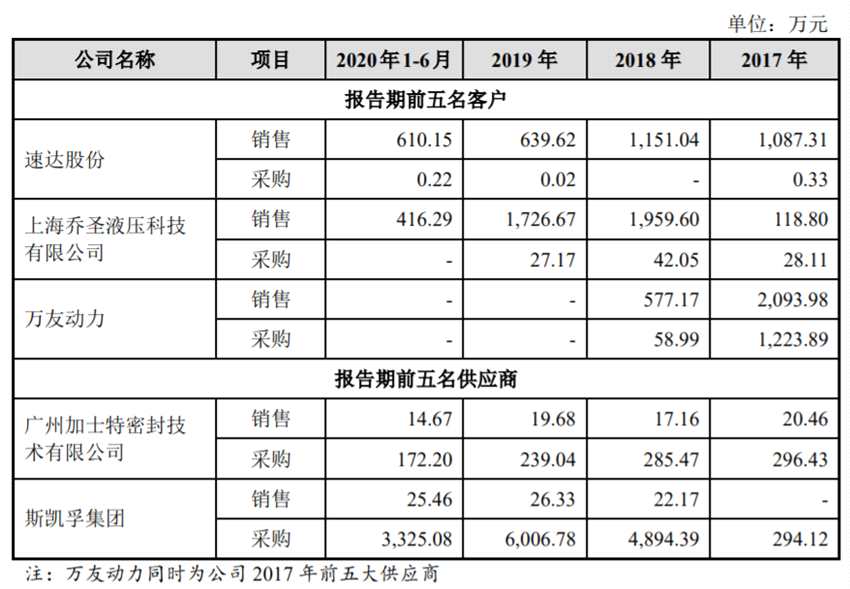 前五名客戶中:公司與速達股份僅發(fā)生零星采購;向上海喬圣液壓科技有限公司采購主要是臨時調(diào)貨采購少量密封包和密封件;萬友動力為公司同一控制權下的貿(mào)易公司,從事密封件的貿(mào)易業(yè)務,在其停止經(jīng)營前,公司會根據(jù)自身業(yè)務需求通過萬友動力采購或銷售相關產(chǎn)品,2018年4月后相關交易不再發(fā)生。
