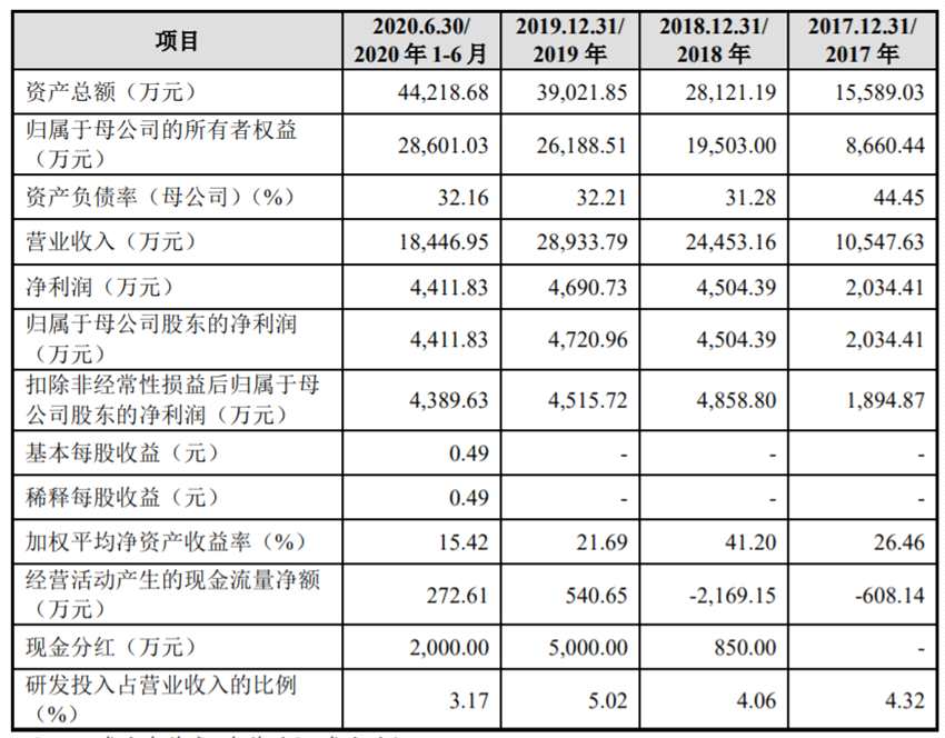 2017年至2020上半年,唯萬密封實現(xiàn)營收分別為1.05億元、2.45億元、2.89億元、1.84億元;同期實現(xiàn)歸屬母公司所有者凈利潤分別為2034.41萬元、4504.39萬元、4720.96萬元、4411.83萬元。
