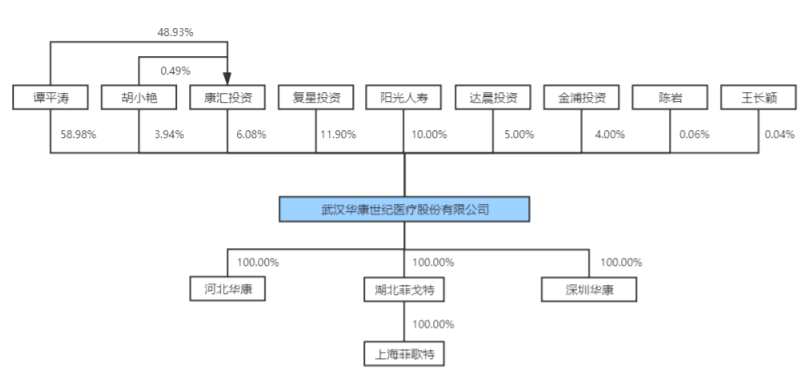 譚平濤直接持有公司4670.90萬股股份,占公司股份總數(shù)的58.98%,為控股股東;譚平濤之配偶胡小艷直接持有312.37萬股股份,占公司股份總數(shù)的3.94%;同時,譚平濤持有員工持股平臺康匯投資48.93%的財產(chǎn)份額,胡小艷持有康匯投資0.49%的財產(chǎn)份額并擔任康匯投資執(zhí)行事務合伙人,譚平濤、胡小艷通過康匯投資間接控制公司481.54萬股股份,占公司總股本的6.08%。綜上所述,譚平濤及其配偶合計控制華康世紀股份總數(shù)為5464.81萬股,占公司股份總數(shù)的69.00%,譚平濤和胡小艷為公司的實際控制人。