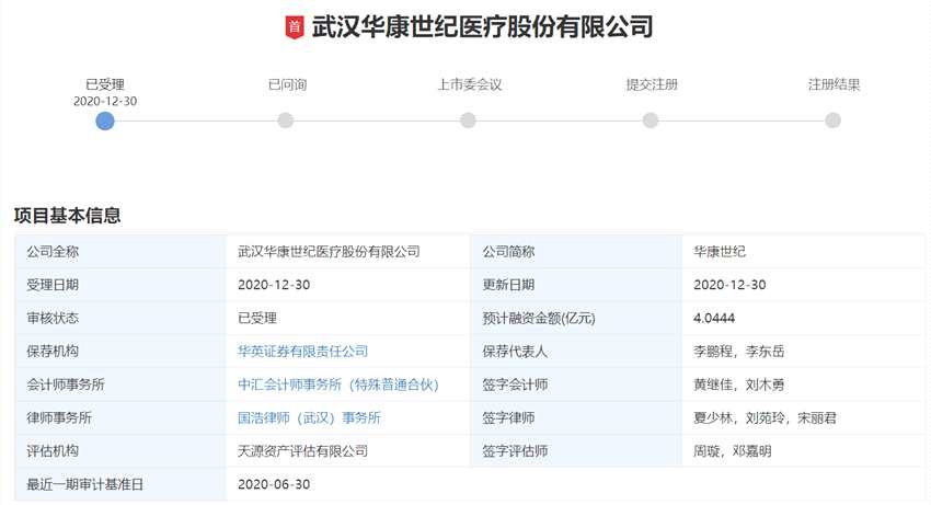 1月11日,獲悉,武漢華康世紀醫(yī)療股份有限公司(公司簡稱:華康世紀)創(chuàng)業(yè)板IPO申請近日獲深交所受理,保薦機構(gòu)為華英證券。