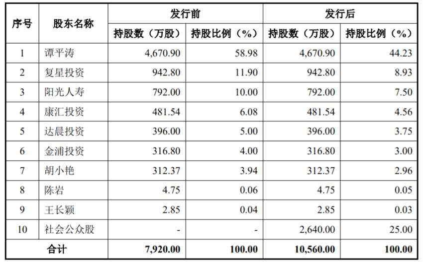 除了以上兩位大股東之外,在股東名單中,我們還發(fā)現(xiàn)了幾大知名企業(yè)的持股情況,復星投資、陽光人壽、達晨投資等身現(xiàn)股東名單中。據(jù)招股書披露,復星投資持股11.9%,陽光人壽持股10%,達晨投資持股5%。
