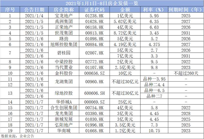 據(jù)不完全統(tǒng)計(jì),截至2021年1月7日,共有19家上市房企發(fā)布合計(jì)超60億美元的債券。