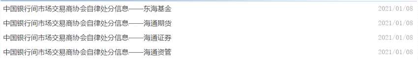 1月11日,獲悉,1月8日晚間,中國(guó)銀行間市場(chǎng)交易商協(xié)會(huì)(下稱:交易商協(xié)會(huì))發(fā)布四則自律處分信息,分別對(duì)海通證券和其下屬兩家子公司上海海通證券資產(chǎn)管理有限公司(下稱:海通資管)、海通期貨股份有限公司(下稱:海通期貨)、及東?;鹩枰跃?,并責(zé)令整改。