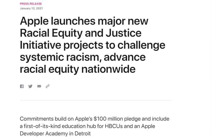 1月14日,了解到,1月14日,蘋果公司在官網(wǎng)宣布推出一系列重大的新項(xiàng)目,作為其1億美元的種族平等和正義計(jì)劃(REJI)的一部分,以幫助消除系統(tǒng)性的機(jī)會(huì)障礙并對(duì)抗有色人種面臨的不公正待遇。