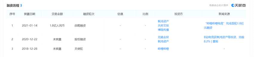 天眼查顯示,嗶哩嗶哩電競(jìng)目前完成了3輪融資,此次戰(zhàn)略融資是該公司第一次公布交易金額。