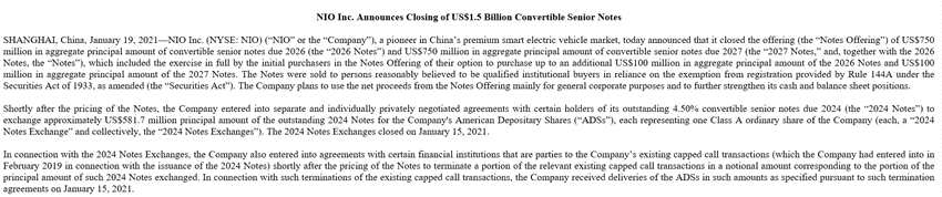 NIO)于1月19日發(fā)布公告稱于,公司已完成發(fā)行("票據(jù)發(fā)行")的總本金7.5億美元2026年到期的可轉(zhuǎn)換高級票據(jù)("2026年票據(jù)"),以及7.5億美元的2027年到期的可轉(zhuǎn)換高級票據(jù)。其中票據(jù)的初始購買者全部行使選擇權(quán),額外購買本金總額不超過1億美元的2026年票據(jù),本金總額不超過1億美元的2027年票據(jù)。