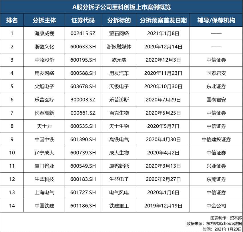 截至2021年1月20日,已發(fā)布分拆子公司至科創(chuàng)板上市預(yù)案的A股上市公司共計(jì)15家。除卻紫江企業(yè)在分拆預(yù)案披露后將子公司預(yù)上市板塊變更為創(chuàng)業(yè)板外,共有14家上市公司選擇分拆子公司至科創(chuàng)板上市。