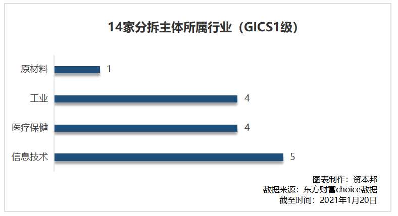 按照GICS一級(jí)行業(yè)分類,上述14家披露分拆預(yù)案的上市公司分別屬于信息技術(shù)、工業(yè)、醫(yī)療保健、原材料行業(yè)。其中,屬于信息技術(shù)行業(yè)的企業(yè)數(shù)量為5家,屬于醫(yī)療保健和工業(yè)行業(yè)的企業(yè)數(shù)量為4家,原材料行業(yè)企業(yè)為1家。