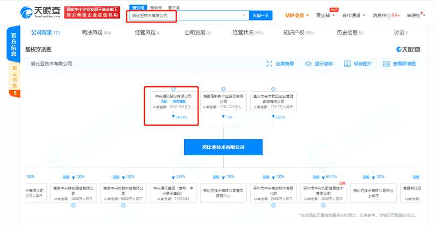 天眼查App股東信息顯示,該公司第一大股東為中興通訊股份有限公司,持股比例為78.33%。2015年3月,該公司發(fā)生工商變更,企業(yè)名稱由深圳市中興移動通信有限公司變更為努比亞技術(shù)有限公司。