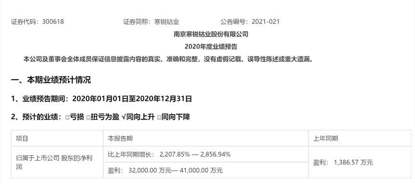 摘要: 1月25日,了解到,上市公司南京寒銳鈷業(yè)股份有限公司(300618.SZ)于近日發(fā)布了2020年度業(yè)績(jī)預(yù)告。