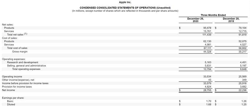 1月28日,了解到,美股上市公司蘋果(AAPL.US)發(fā)布截至2020年12月26日止三個月財報。財報顯示,蘋果第一財季凈銷售額為1114.39億美元,同比增長21.4%。其中,來自產(chǎn)品的凈銷售額為956.78億美元,同比增長21%。