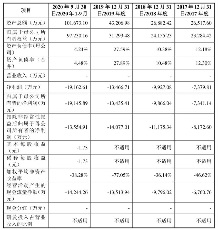 2017年至2020年前三季度,瑞博生物尚未形成營業(yè)收入,實(shí)現(xiàn)歸母凈利潤分別為-7,341.14萬元、-9,866.04萬元、-1.34億元、-1.91億元。報(bào)告期內(nèi),公司仍處于產(chǎn)品研發(fā)階段,尚未實(shí)現(xiàn)商業(yè)化,在研產(chǎn)品尚未形成營業(yè)收入,公司的研發(fā)投入持續(xù)增長,以及對核心員工的股權(quán)激勵(lì)費(fèi)用導(dǎo)致公司累計(jì)未彌補(bǔ)虧損不斷增長。