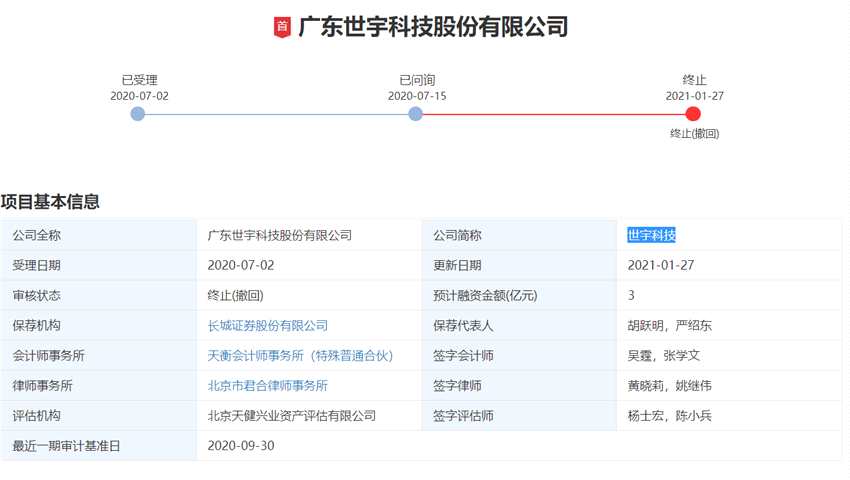 世宇科技創(chuàng)業(yè)板IPO于2020年7月2日獲深交所受理,并于7月15日受問詢。2021年1月18日,世宇科技主動申請撤回發(fā)行上市申請文件。